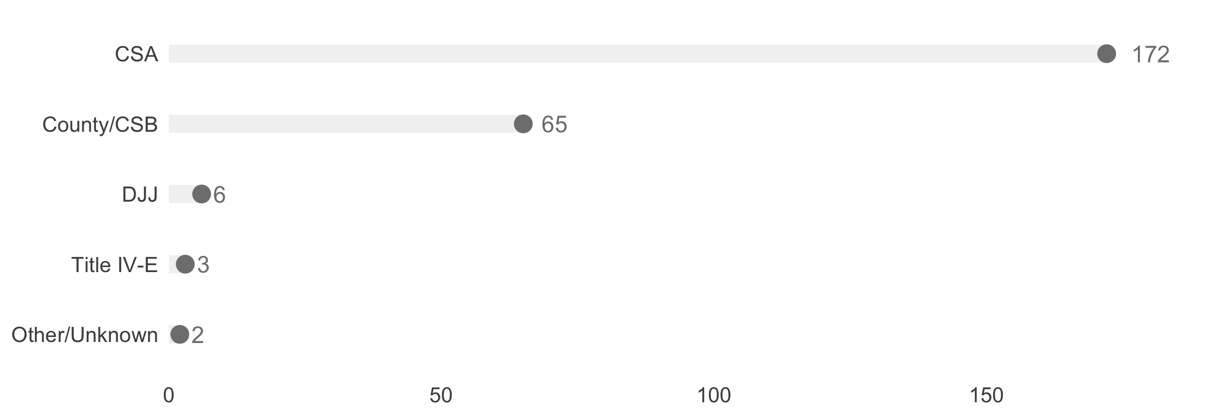 Figure 5 breaks down the number of cases funded by major payors, as reported by provider organizations for known cases (CEP-Va estimates an additional 30 cases were served during this period, but are unaccounted for). The data show that CSA is the major funder of HFW cases in Virginia, followed by County and Community Service Board (CSB) funding.